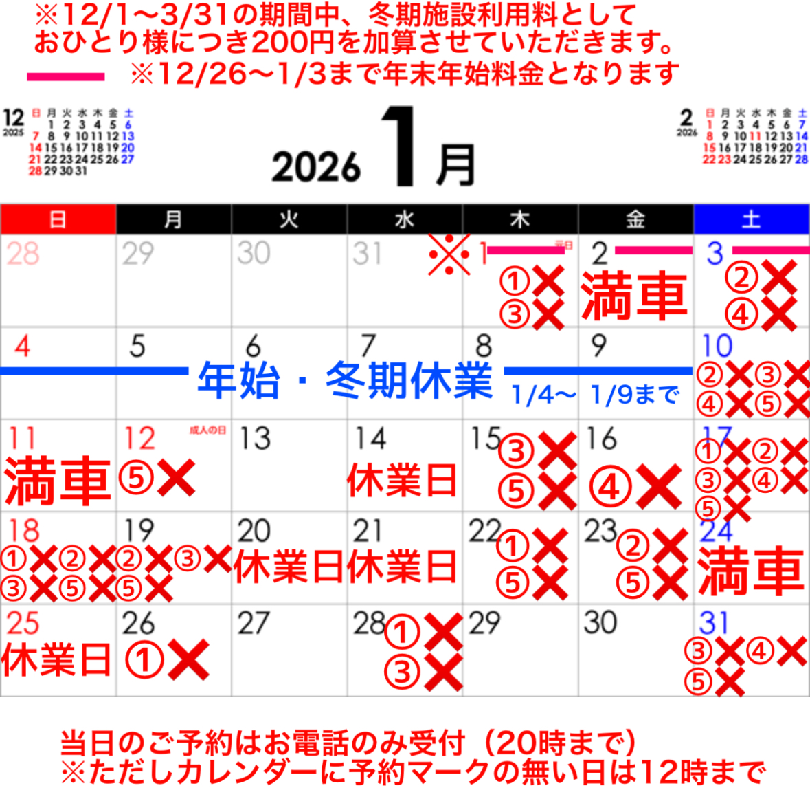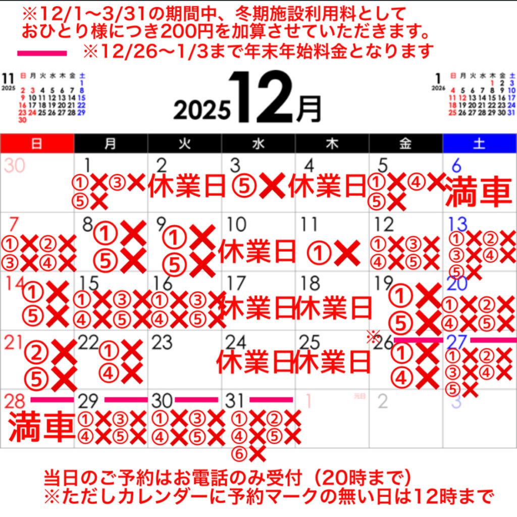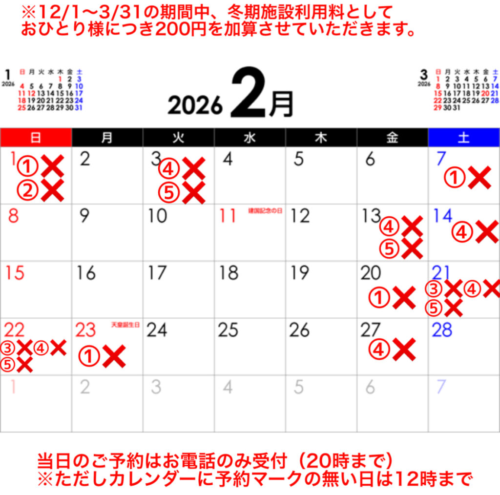 ※12/1〜3/31まで冬期施設利用料1名様につき200円加算させていただきます。